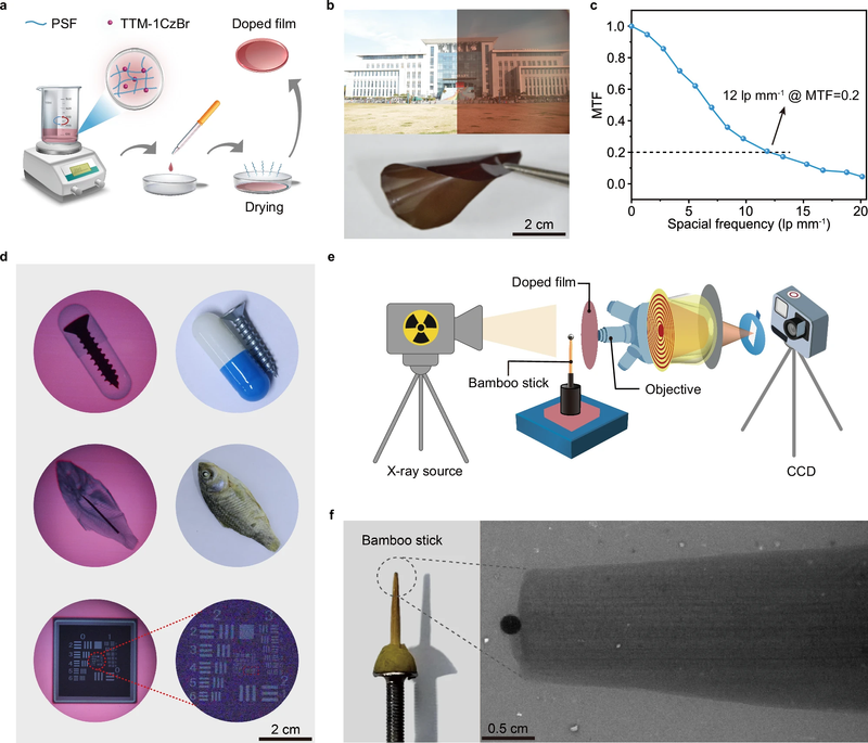 针对这一问题,南京邮电大学黄维院士、陈润锋教授、陶冶教授团队和福州大学陈秋水教授提出将开壳型有机发光自由基作为闪烁体,设计制备了两种卤代三苯甲基发光自由基(图1)。该类自由基闪烁体材料在X射线激发下只形成跃迁允许的双线态激子,理论上可以实现100%的激子利用效率,并且它们表现出强的X射线吸收、优异的X射线辐射发光稳定性和纳秒级的辐射发光寿命(⁓18 ns),其X射线辐射发光性能可以与经典闭壳型闪烁体材料相媲美。良好的X射线辐射发光性能使得这类自由基闪烁体材料不仅可用于X射线照相术中对各种物体进行对比成像,还适用于医学高分辨率显微CT成像系统,对竹签的纤维脉络进行清晰成像(图2)。该研究工作不仅证实了纯有机发光自由基作为高效闪烁体的可能性,也为有机闪烁体材料在X射线成像中的商业化应用提供了宝贵的经验。