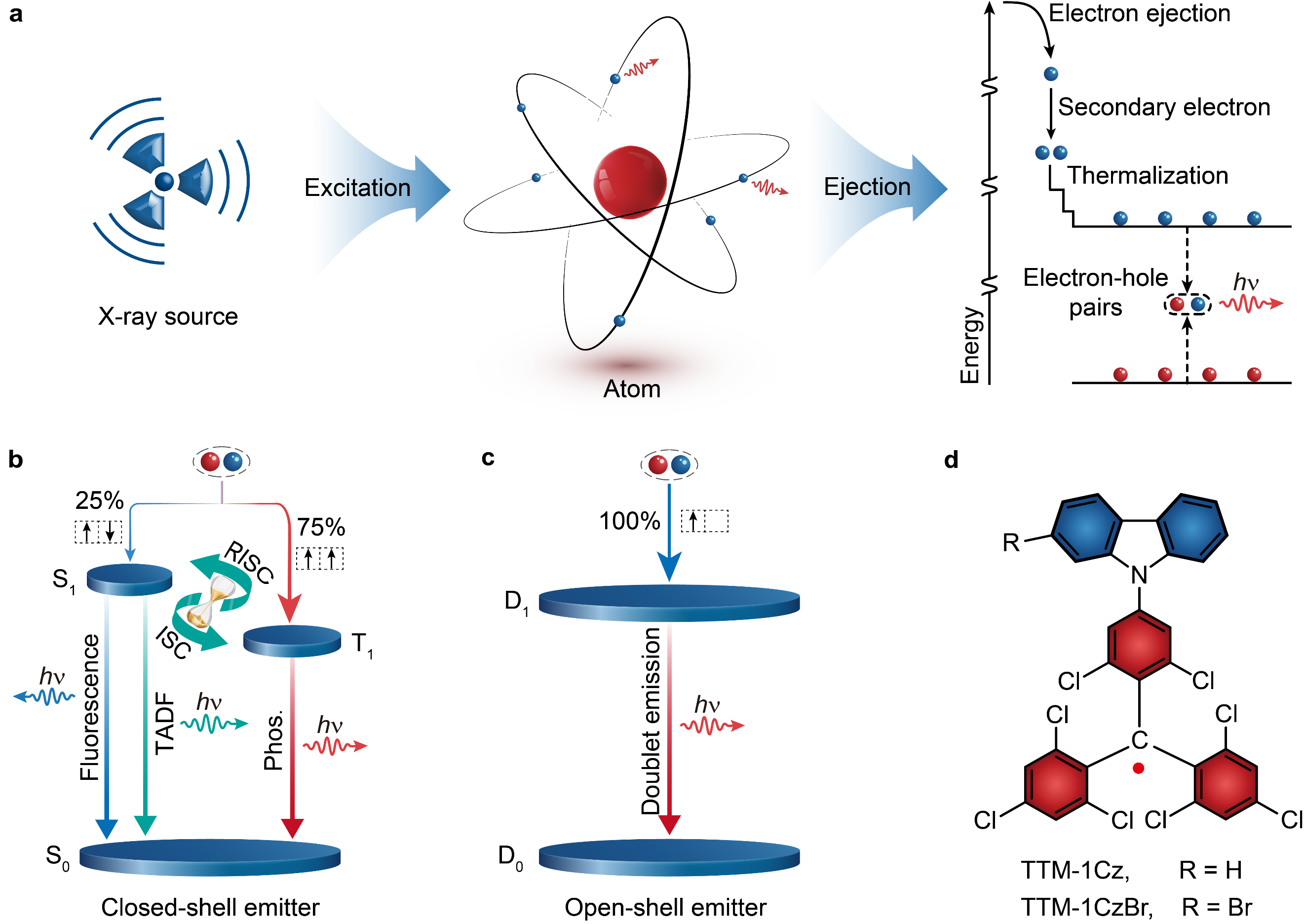 有机X射线闪烁体材料因其结构易于修饰、成本低廉、生物兼容性良好等优点,在辐射检测、活体成像及光动力治疗等领域展现出广泛的应用潜力,成为近年来材料化学研究的热点。然而,目前大多数纯有机闪烁体为闭壳分子,X射线辐射下会生成约75%难以辐射发光的三线态激子,导致激子利用率低、发光寿命较长等问题。因此,设计和制备同时具备高激子利用率和短发光寿命的有机X射线闪烁体材料,已成为该领域亟待解决的关键问题。