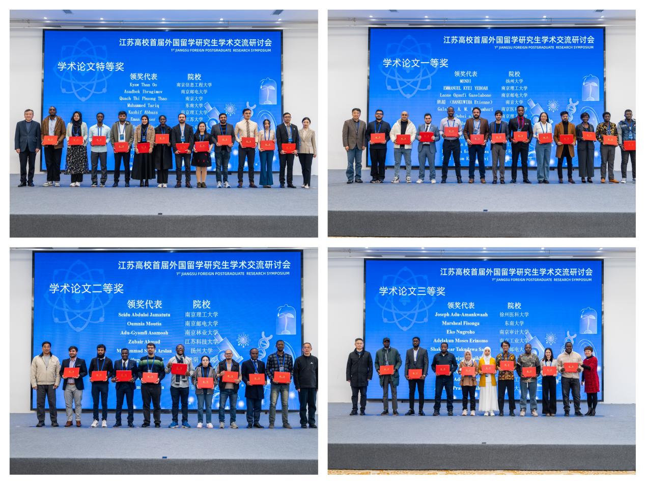 11月30日至12月1日,江苏高校首届外国留学研究生学术交流研讨会在镇江举行。我校留学生获“学术论文奖”特等奖、一等奖、二等奖、三等奖各1项,学校荣获“优秀组织奖”。