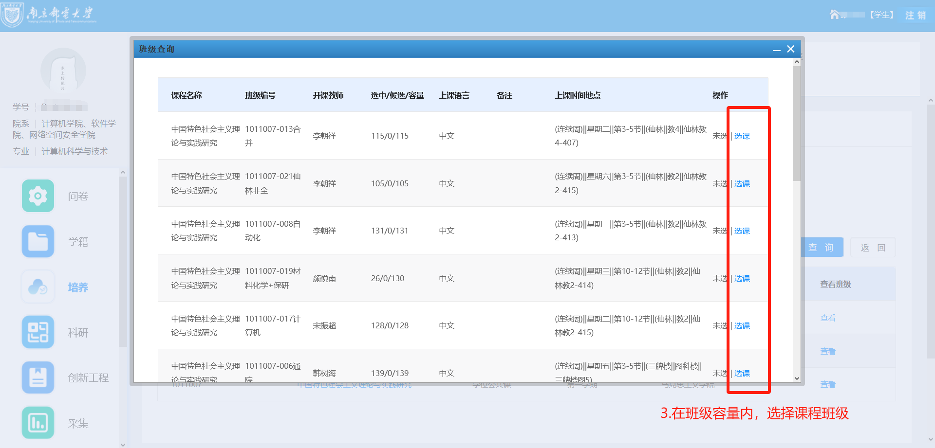 2、若课程班级后有类似(非全日制班级/全日制班级)等文字标识,务必按照符合要求的文字标识选相对应的班级;集成电路学院培养方案内课程号前有“JC”标识(班级开设在浦口),可选择去“JC”标识课程代替(班级开设在仙林或三牌楼)。(例:JC1011007课程可选1011007)。