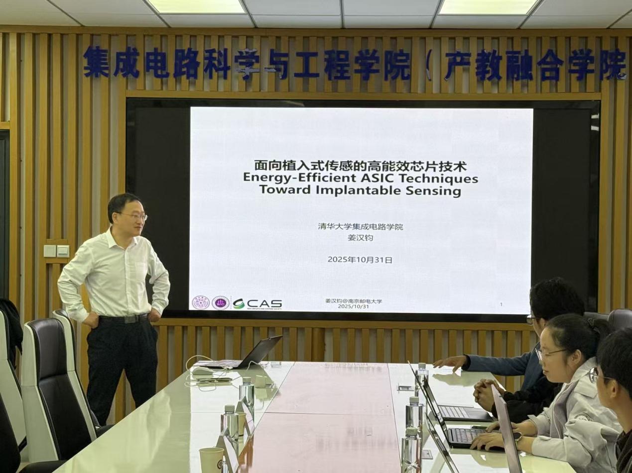 2025年10月31日下午,应我校集成电路与科学工程学院邀请,清华大学集成电路学院副院长姜汉钧教授在仙林电光学科楼B223会议室作了题为“面向植入式传感应用的高能效芯片技术”的学术报告。集成电路与科学工程学院10余名青年教师和学生代表参加活动,讲座由张吉良院长主持。