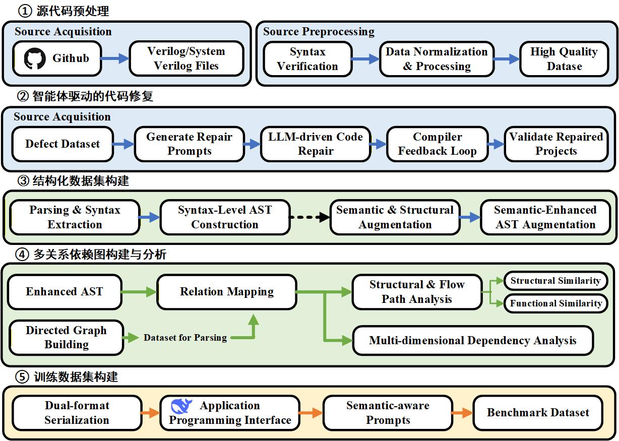 近日,我校集成电路科学与工程学院郭宇锋教授团队在ACM International Conference on the Foundations of Software Engineering (FSE) 2026 发表创新研究成果“VerilogASTBench: Benchmark Construction of Verilog AST Dataset with Dual-Stage AST Semantic Enhancement Framework“, 第一作者为张鲁萍博士,通讯作者为严大鹏老师。该研究针对Verilog代码生成过程中高质量、大规模训练数据集缺失导致语法与功能正确性不足的问题,提出了一种基于抽象语法树的语义增强技术,用于构建高质量的Verilog数据集。该研究从GitHub开源代码库中收集了1,035,777条Verilog代码样本,并对进行数据清洗,最终构建了包含318,021条高质量样本的Verilog数据集。实验结果表明,在该数据集上微调后,CodeQwen-7B在 Verilog 代码生成任务中的准确率提升9.02%,并在 VerilogEval 基准上优于 GPT-4。