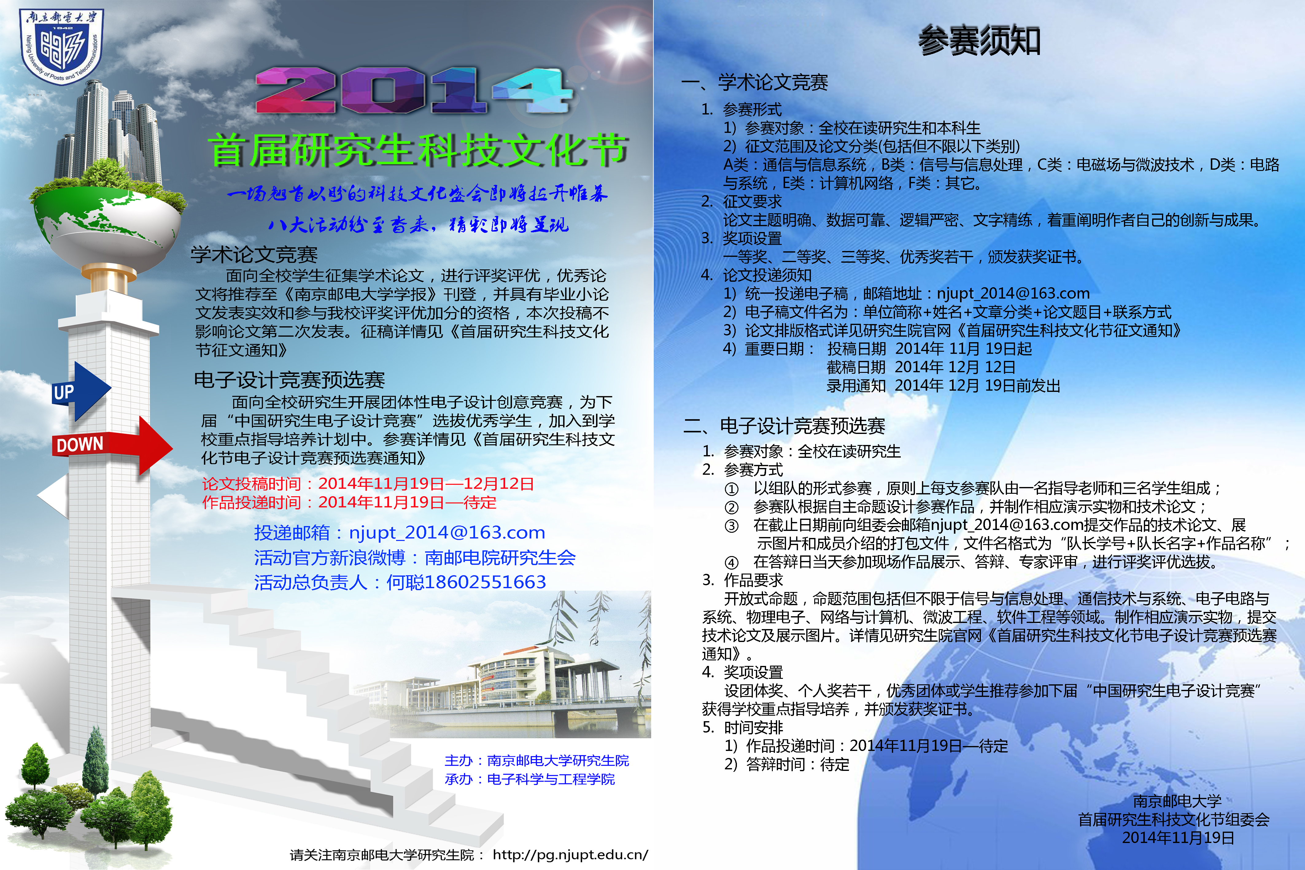 由南京邮电大学研究生院主办,电子科学与工程学院承办的首届研究生科技文化节,将于2014年12月15日召开。