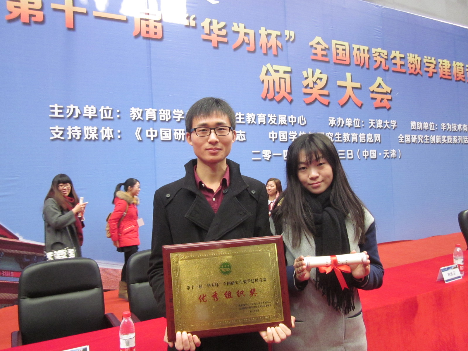 12月13日,第十一届“华为杯”全国研究生数学建模竞赛颁奖典礼在天津大学隆重举行,我校派研究生院老师和2名获奖研究生代表参加了典礼。本次竞赛,我校共有21支队伍获奖,其中全国一等奖1项,二等奖8项,三等奖12项,获奖率66%。同时,全国共有371家参赛单位参加本届数模竞赛,经过严格评选,38个单位荣获“优秀组织奖”,我校凭借优异的竞赛成绩和良好的组织管理工作脱颖而出,成为江苏省获此项荣誉的5所高校之一,这是我校连续第六年获此殊荣。
