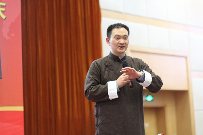 活动伊始由邓艳华副书记上台致辞,邓书记借用最近热映的电视剧《三生三世十里桃花》中的热词,鼓励在座的研究生以一颗勇敢“历劫”的心,带着“元神”投入学业,参与活动,必将“受益三生三世,收获十里桃林”。在一阵热烈的掌声中,洪海江老师以一袭长袍闪亮登场。