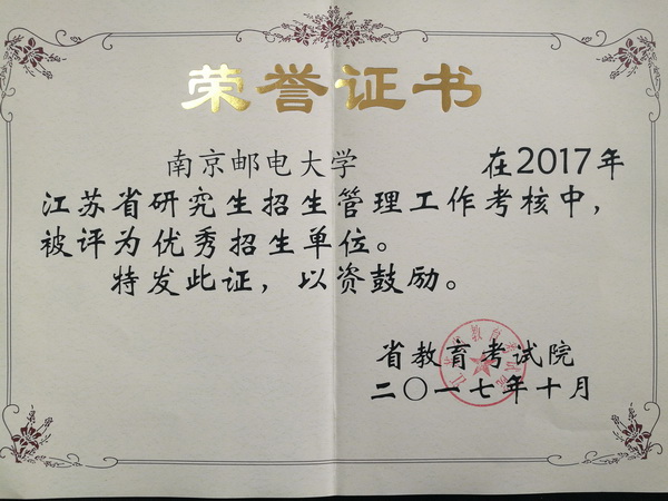 近日,省教育考试院组织召开了江苏省2018年研究生招生工作会议,会上公布了2017年江苏省研究生考试招生管理工作考核结果,并对考核优秀的招生单位进行了表彰。本年度考核采取定量考核和定性考核相结合、年终考核和过程考核相结合、单位自评和考试院复评相结合的办法,按照考务管理和招生管理考核总得分分项排名,我校以满分1000分的好成绩,再次被评为“优秀招生单位”。
