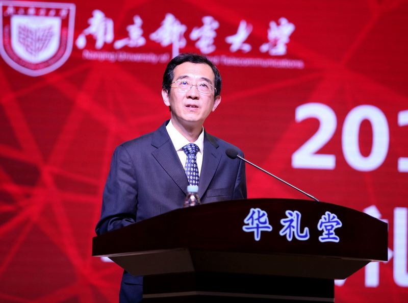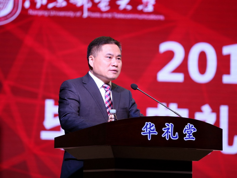 校长、校学位评定委员会主席杨震教授宣读2018年度研究生学位授予决定,并发表了热情洋溢的讲话。他代表学校向获得博士、硕士学位的全体毕业生表示祝贺,向辛勤培育他们的导师和支持他们成长成才的亲友表示感谢。他特别介绍了毕业典礼所在地“华礼堂”的修缮启用情况和深刻寓意,希望大家铭记我校首任党委书记兼院长秦华礼为南邮发展做出的杰出贡献,让“信达天下、自强不息”的南邮精神代代相传。回顾学校发展和同学们的在校时光,杨校长高度赞赏他们用智慧和汗水为学校发展添砖加瓦、为实现人生梦想奠基固本的青春风采,并以“做新时代的奋斗者!”作为给即将踏上人生新旅程的全体研究生的临别赠言。他强调,做新时代的奋斗者,要保持奋斗的姿态。在社会发展瞬息万变的新时代,南邮人要恪守“厚德、弘毅、求是、笃行”的校训,始终保持学习和奋斗的姿态,不断与时俱进,勇于自我革新,敢于引领时代,做时代的弄潮儿;做新时代的奋斗者,要找准奋斗的方向。76年来,南邮人始终情系国脉,与国家信息通信事业的进步同呼吸、共命运,一大批校友成为信息产业的人才、技术精英、管理骨干。希望大家将个人梦想融入我国“两个一百年”的宏伟蓝图,抓住信息通信行业高速发展的机遇,找准个人奋斗的方向,在新时代里大展宏图;做新时代的奋斗者,还要坚守奋斗的底线。希望大家自觉抵御社会上的各种诱惑,守住做人、处事、用权、交友的底线,绝不能触犯法律和道德底线,清清白白做事,干干净净做人,自觉追求真善美,做一个品德高尚的南邮人。