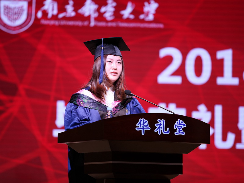 2018届毕业研究生代表、马克思主义学院硕士研究生杨婷同学在发言中表示,在南邮的日子里,同学们学会了相互合作,学会了分析与思考,也学会了如何不断超越自己的极限而成长。她感恩南邮让大家成就了最好的自己,并表示,将不忘初心、继续前行,做“有理想、有本领、有担当”的新时代青年。