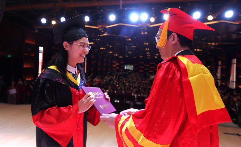 校长杨震教授为2018届博士学位获得者拨流苏,颁发博士学位证书并合影留念