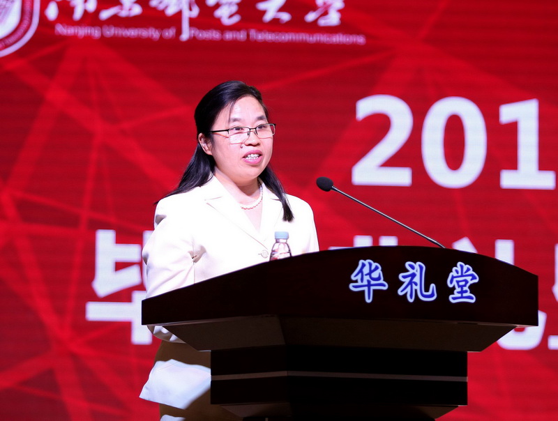 “30多年来,我一直感恩母校、感怀师恩,也一直感谢我的学生,因为是学生成就了老师!”南邮首批博士毕业生、研究生导师代表、通信与信息工程学院党委书记李飞教授忆往惜今,满怀深情地表达了此刻和同学们一样的激动、喜悦与感伤之情。她以“自适应”“勇敢”“兼容”三个词相赠,希望同学们今后在保持一颗自由而年轻、真诚而脱俗的心灵的同时,尽快适应环境的变化,学会包容别人、赏识别人,学会换位思考,在奋斗的路上勇往直前、踏歌而行、快乐生活,并向同学们真诚表示:“母校是你永恒的港湾,你永远是老师的牵挂……”