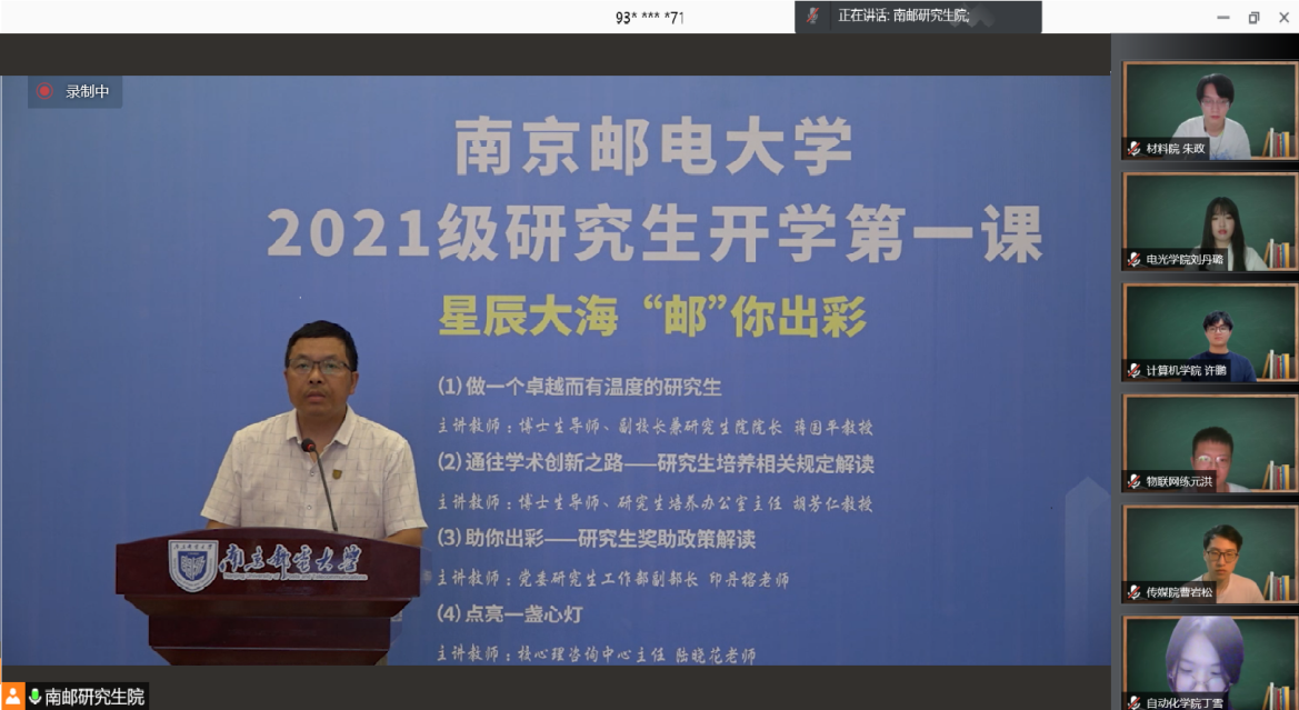 校党委常委、副校长兼研究生院院长、博士生导师蒋国平教授首先给同学们上思政专题课,他主讲的主题是《做一个卓越而有温度的研究生》。蒋国平副校长对研究生新同学表示欢迎,他简要回顾了中国共产党建党100周年的奋斗历史,带领同学们学习了习近平总书记在庆祝中国共产党成立100周年大会上的讲话,特别是强调了青年的时代定位。他向同学们介绍了我校研究生教育的发展历程和主要成效,对同学们提出四点要求:一是守求真之本、厚德以修身,二是拓求新之路、弘毅以自强,三是秉求实之风、志高以行远,四是扬求合之帆、博采以明智,并勉励2021级研究生传承南邮“情系国脉、艰苦奋斗”的精神,以红色基因铸魂,忠诚于党,矢志报国,做一个卓越而有温度的南邮研究生。