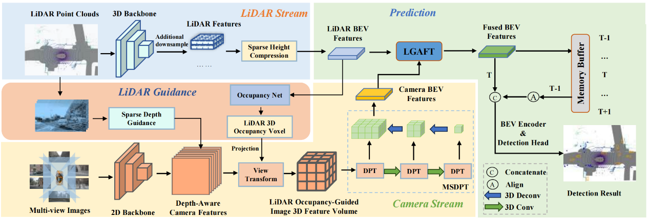 此项研究聚焦于多模态3D目标检测,特别是在鸟瞰图(BEV)视角下的应用,这是一个极具挑战性的领域。他们提出了一种创新的方法,名为GAFusion,它通过稀疏深度引导(SDG)和激光雷达占据引导(LOG)来生成具有丰富深度信息的3D特征,并利用激光雷达引导的自适应融合transformer(LGAFT)从全局角度增强不同模态BEV特征之间的交互。此外,李啸天同学研究团队还设计了一个BEV网格来存放多尺度下采样特征,并开发了多尺度双路径transformer(MSDPT),以扩大不同模态特征的接受域,显著提高了检测性能。GAFusion有助于自动驾驶领域安全性的重大提升,也为多模态3D目标检测领域后续的研究提供更多的见解。