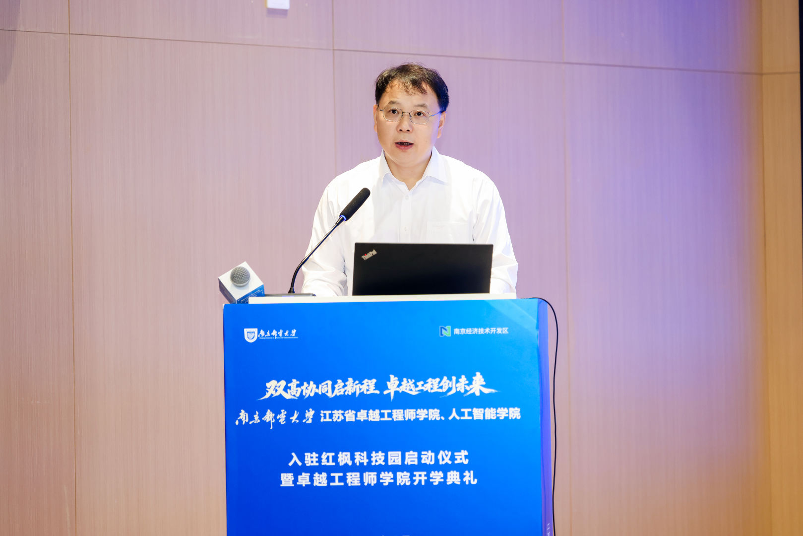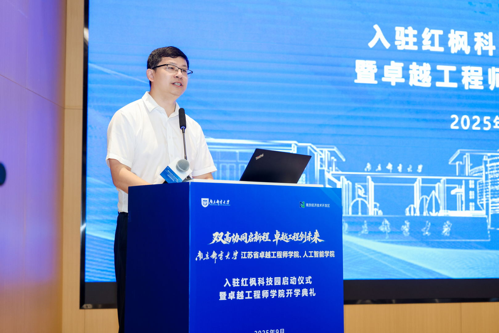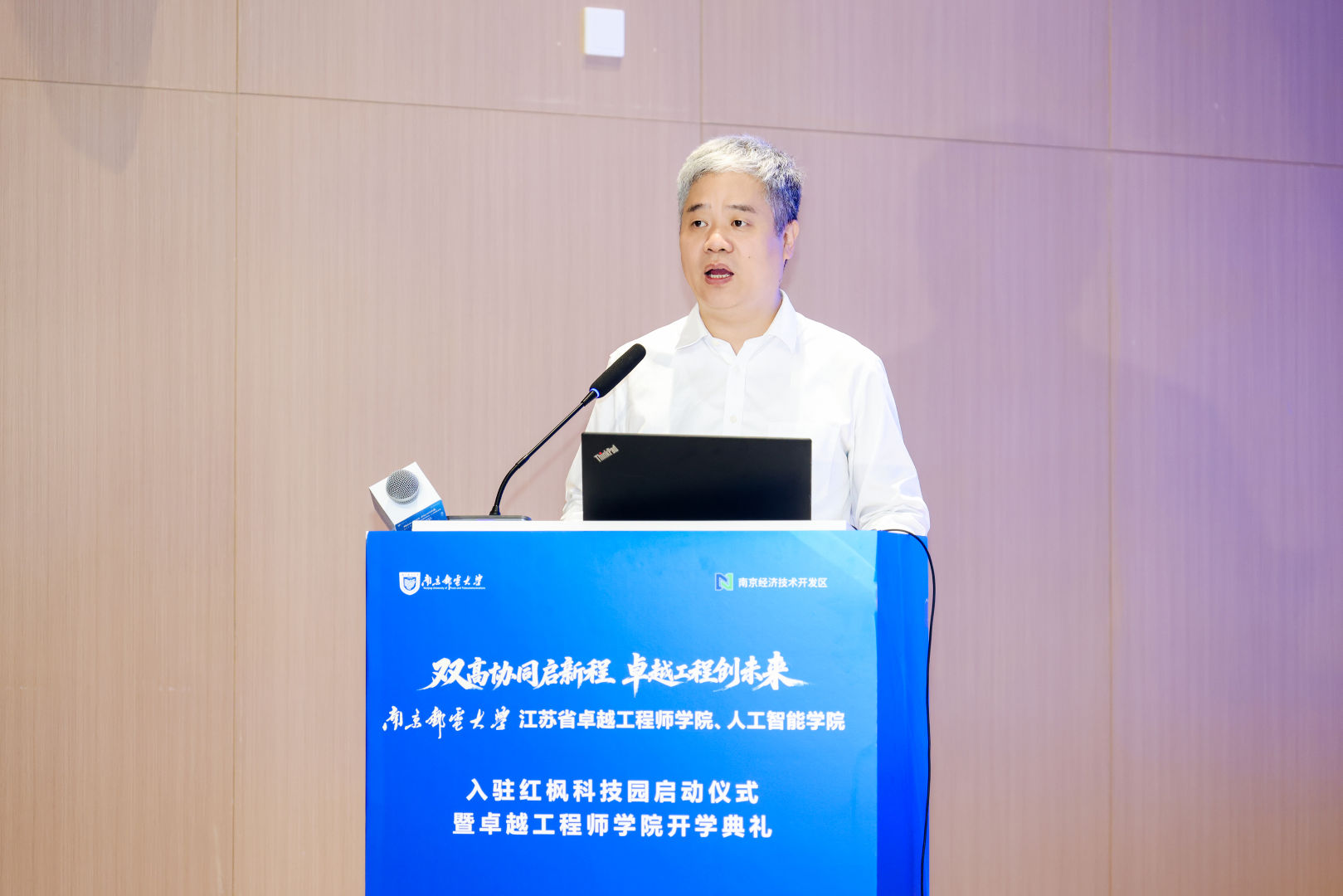 金秋九月,丹桂飘香,红枫叠翠,卓越启航。9月22日上午,南京邮电大学江苏省卓越工程师学院、人工智能学院入驻红枫科技园启动仪式暨卓越工程师学院开学典礼在南京经济技术开发区红枫科技园B3栋二楼报告厅隆重举行。江苏省教育厅研究生处处长金科,南京经开区党工委副书记、管委会主任蓝军,南京邮电大学党委书记郭宇锋,校党委常委、副校长肖甫、刘青山等领导出席仪式,与来自政府部门、理事单位、合作企业及学校相关职能部门的嘉宾、师生代表齐聚一堂,共同见证这一校地企协同育人的历史性时刻。